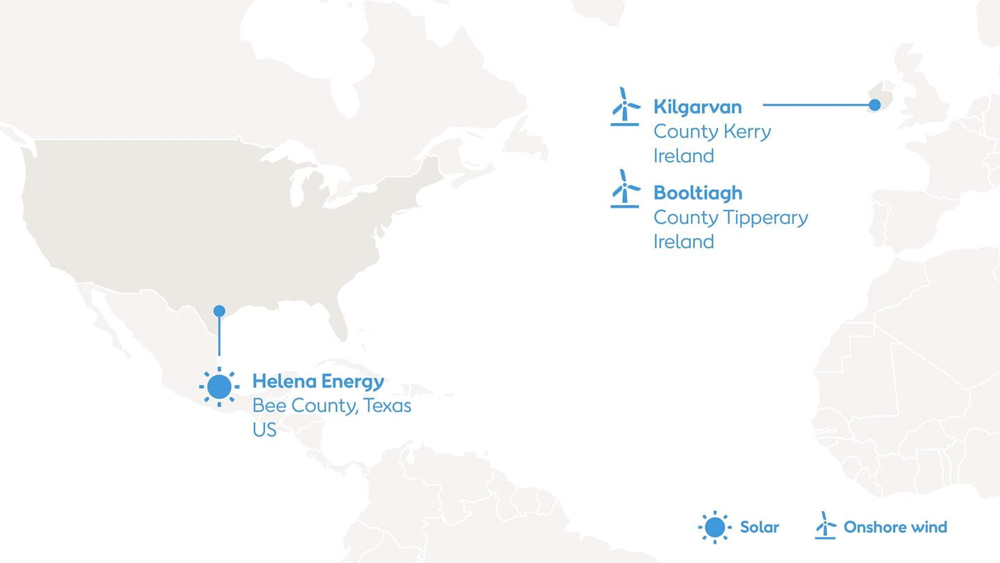 Ørsted har indgået to elkøbsaftaler med den amerikanske medicinalgigant Johnson & Johnson om, at de skal aftage strøm fra solcelleanlægget Sparta Solar i Texas i USA og landvindmølleparkerne Kilgarvan i County Kerry og Booltiagh 1 i County Clare, der ligger i henholdsvis det sydlige og vestlige Irland.